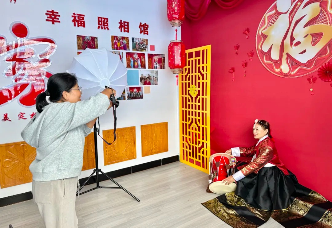 穿着社区免费提供的朝鲜族服装拍照片,开心的笑容感染了现场的每一个人。