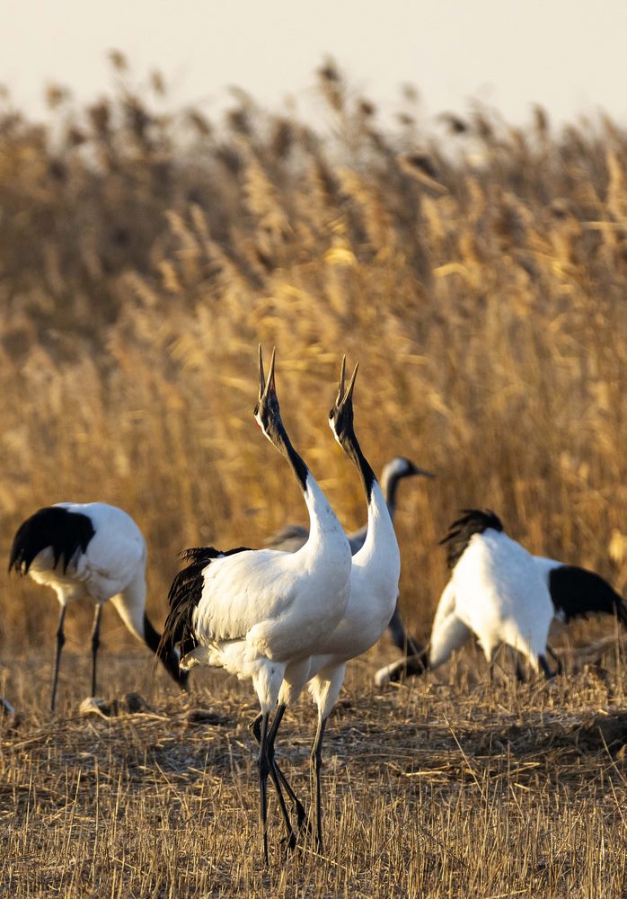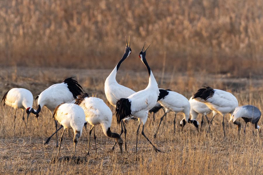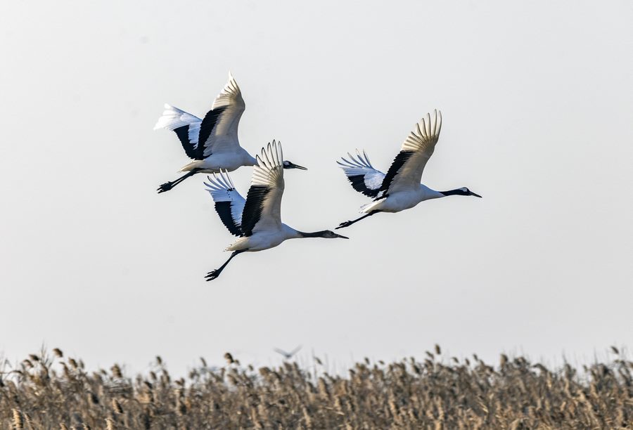 目前,大批丹顶鹤飞抵江苏盐城湿地珍禽国家级自然保护区越冬。该保护区位于黄海之滨,是全球9条候鸟迁飞通道之一的“东亚-澳大利西亚”路线上的重要一站,每年都有超过600只野生丹顶鹤来这里越冬。