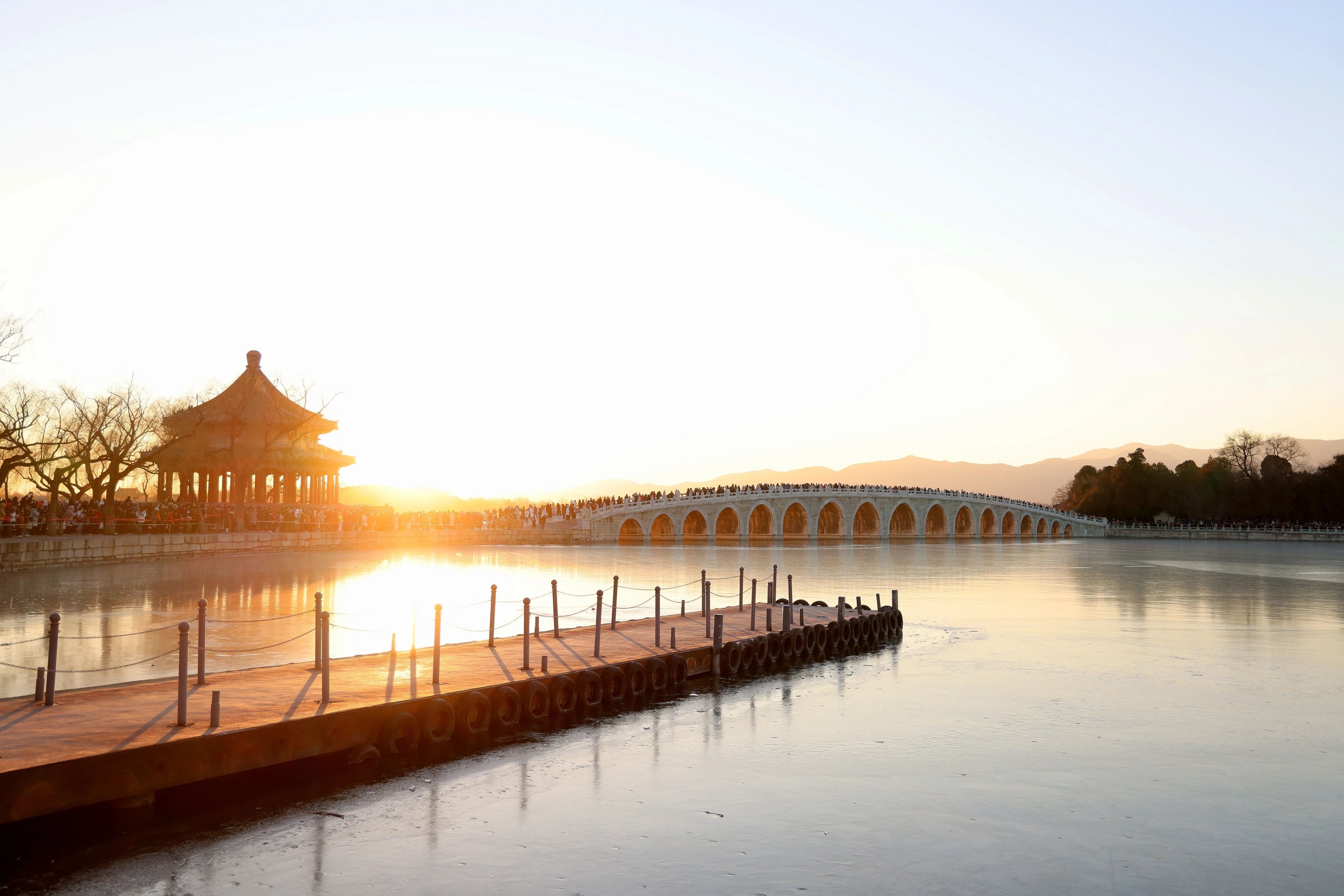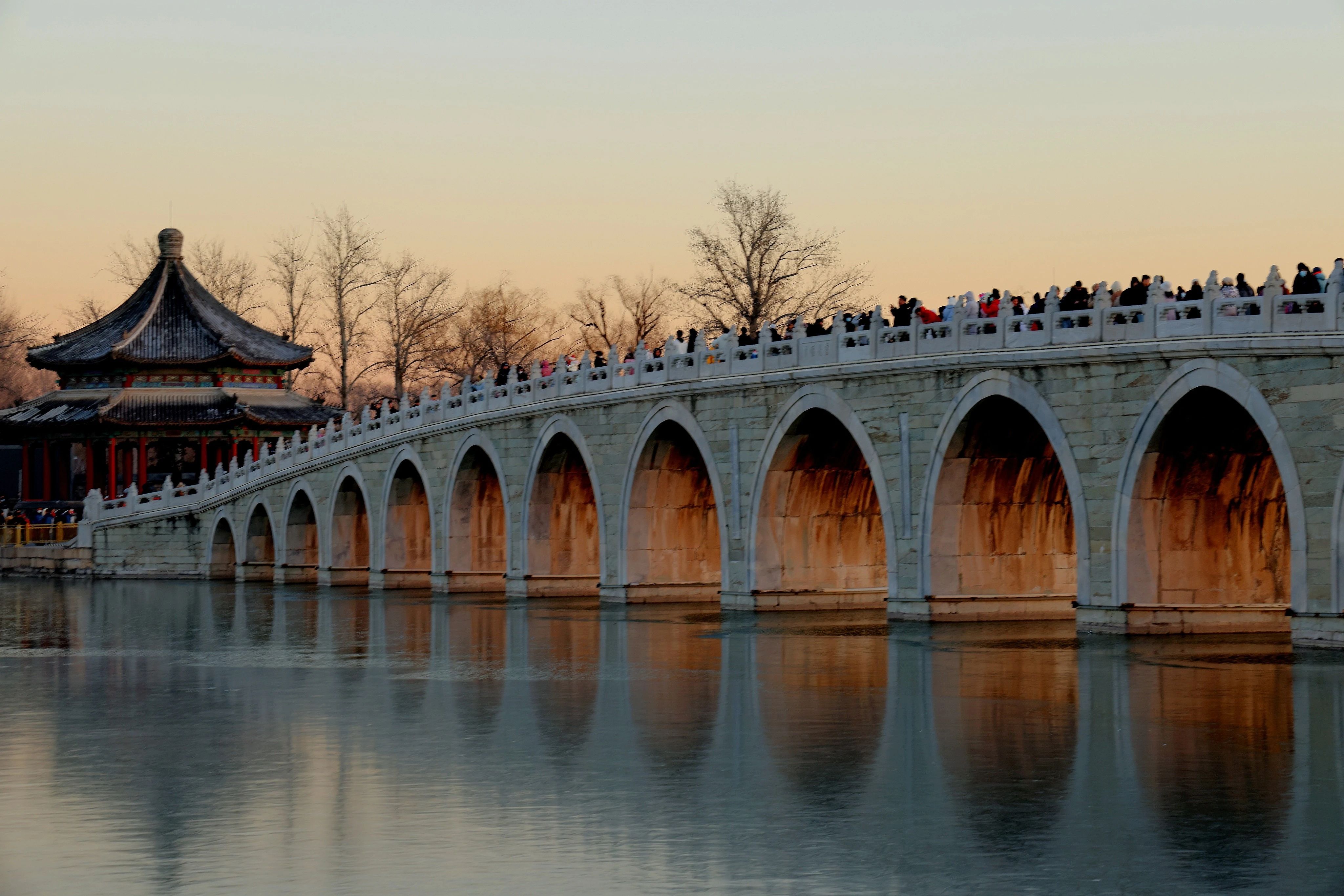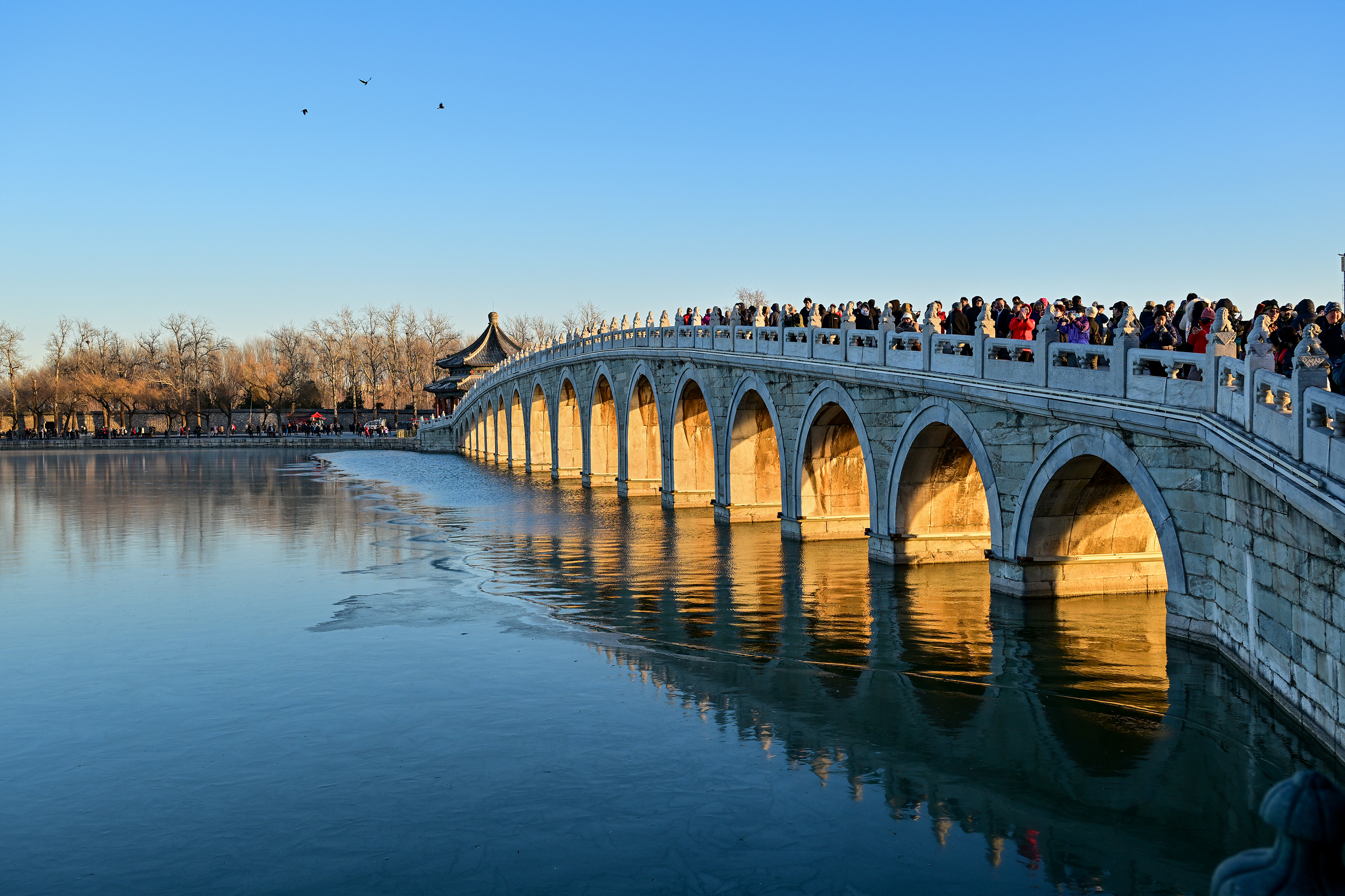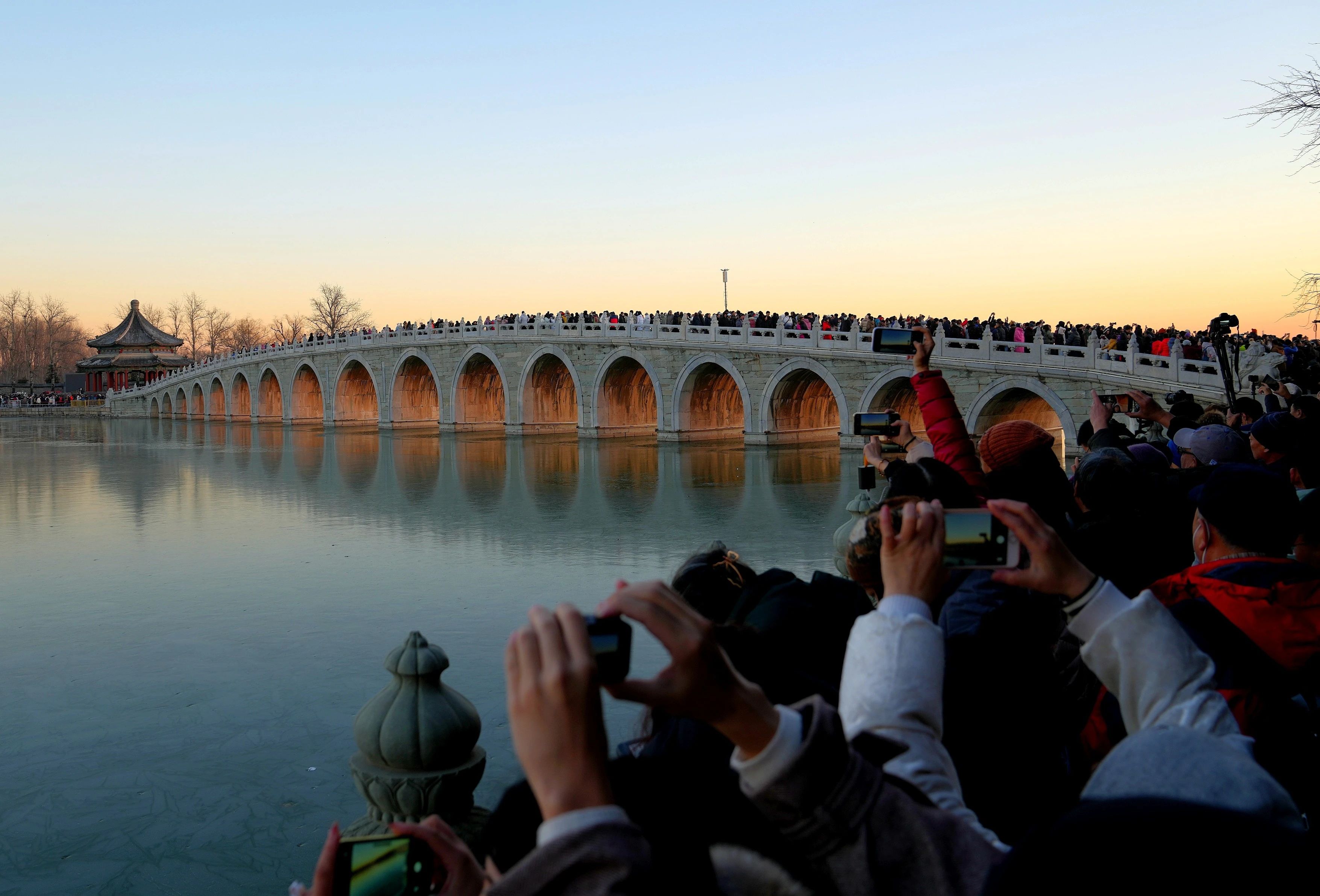 每逢冬至前后,北京颐和园十七孔桥便会上演“金光穿洞”的自然奇观。