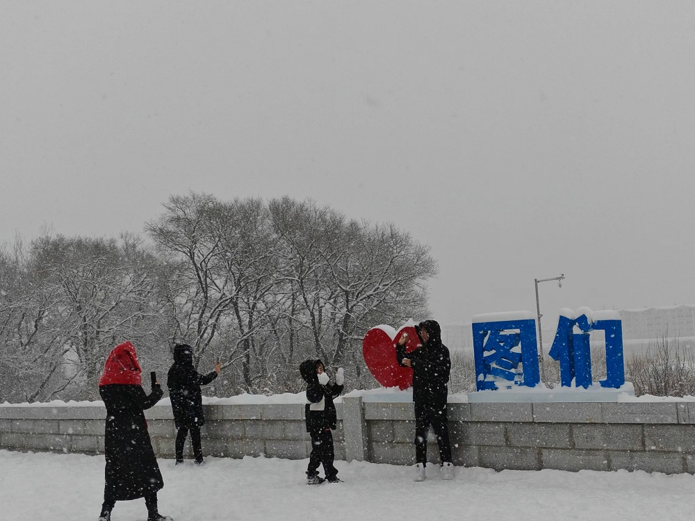 在图们江码头,纷飞的雪花让来自安徽的陈天一小朋友格外兴奋。只见他一会儿从地上捧起积雪抛向天空,一会儿团起雪球和妈妈打雪仗。他的妈妈告诉记者,趁着春节假期带孩子出游,让他见世面、阔眼界、增阅历。没想到会在除夕当天会遇到大雪,远处的山峰和近处的树枝都被积雪覆盖,好像置身于童话世界,这次图们之旅一定会给孩子留下非常深刻的记忆。