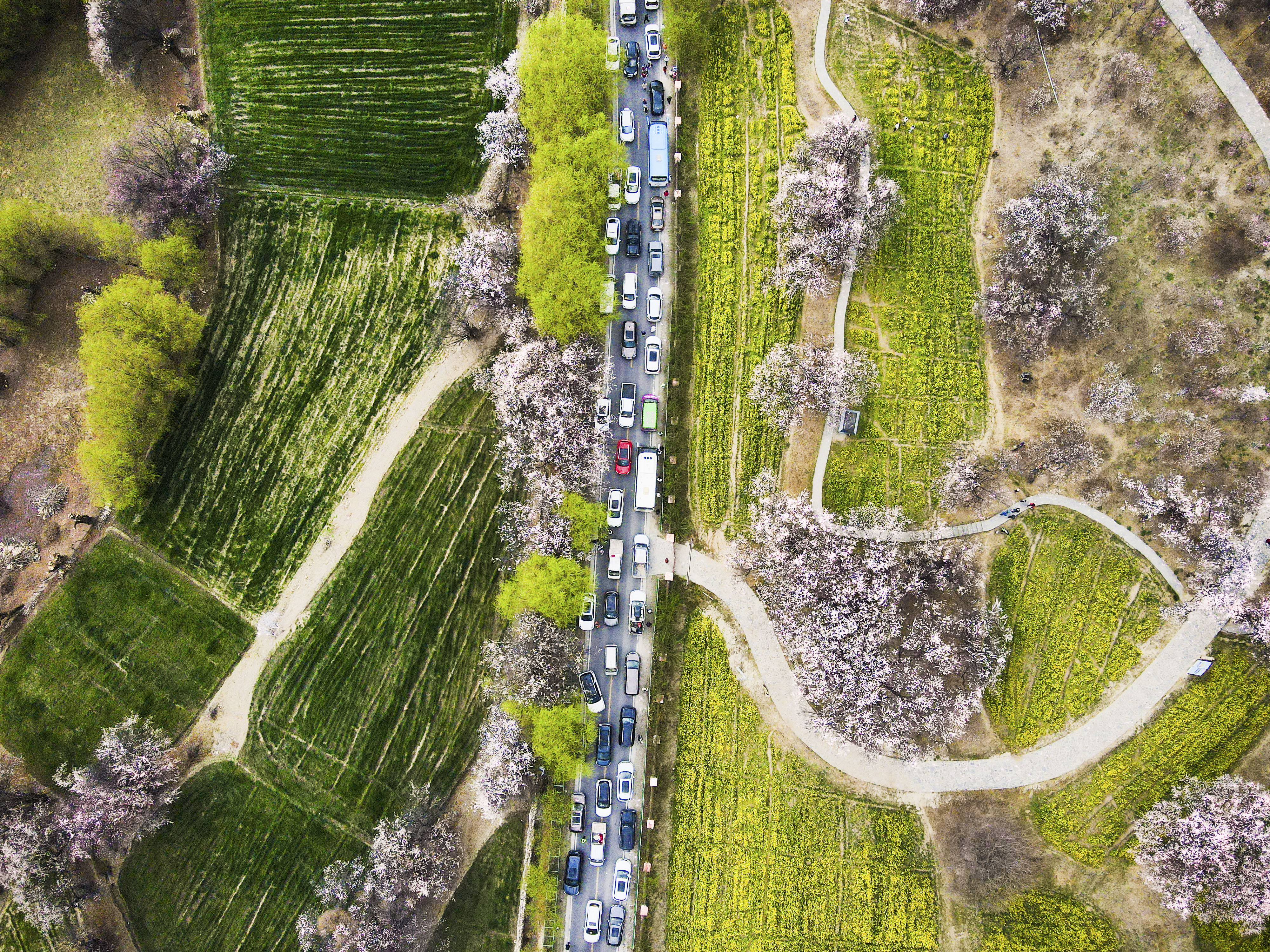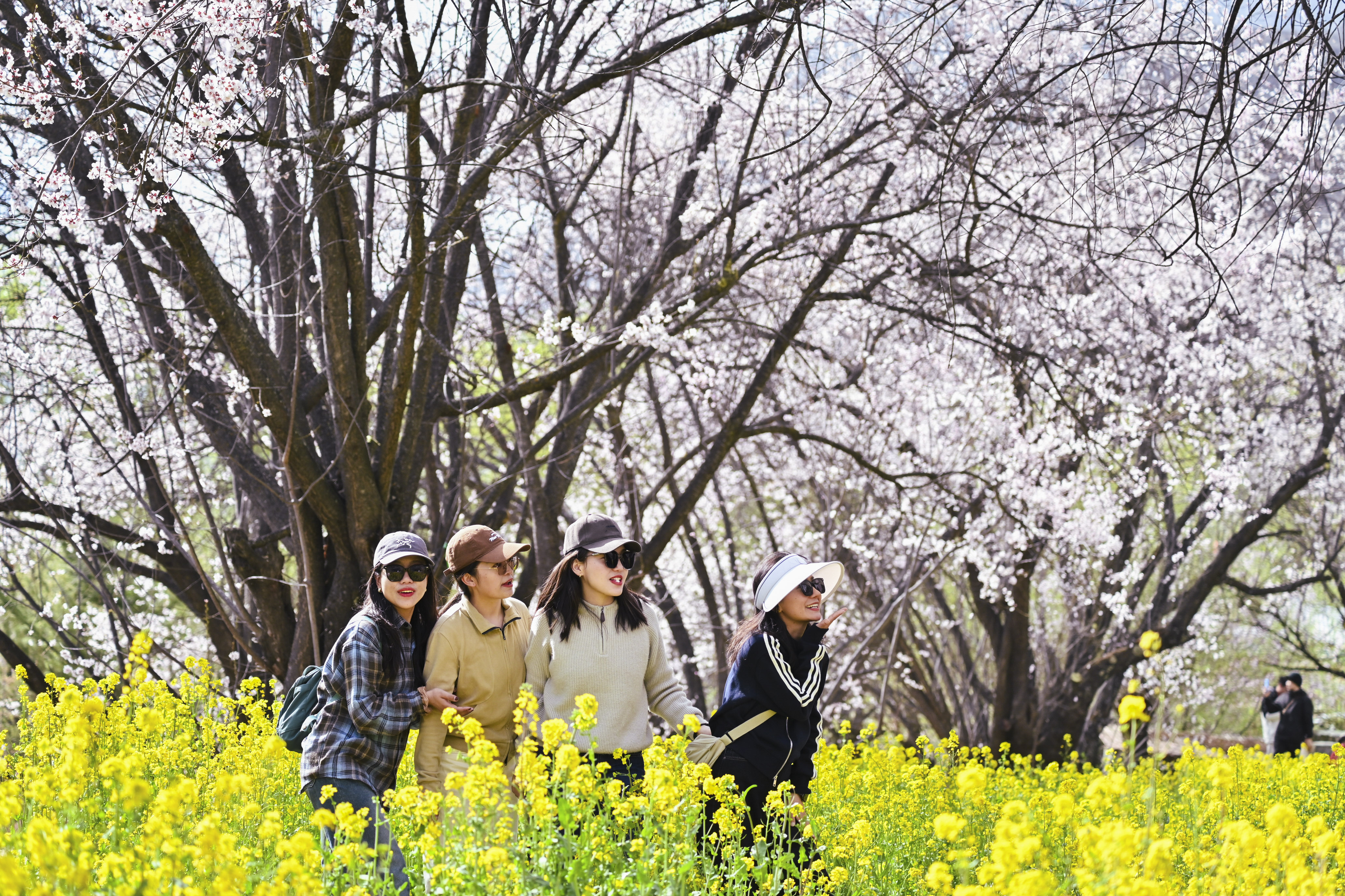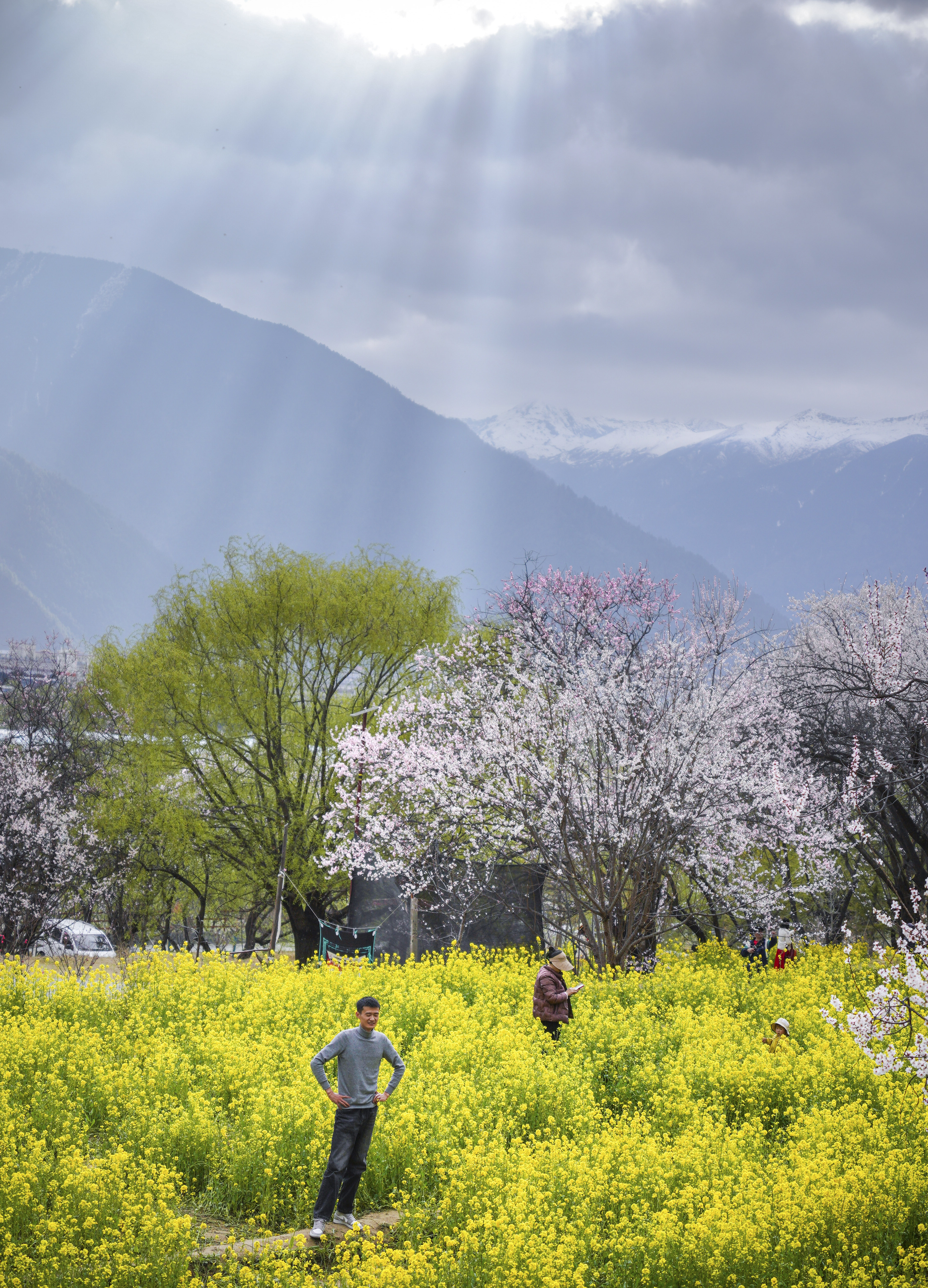 西藏林芝市被誉为“雪域江南”。近日,随着天气回暖,桃花竞相盛开,吸引众多游客前来赏花,感受春天的气息。