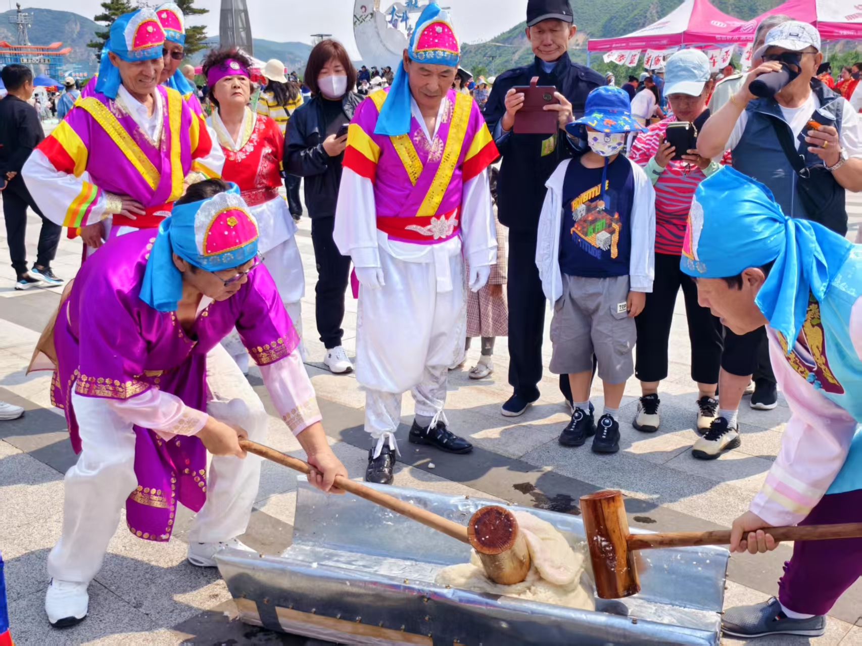 活动以创新的“集五福”形式串联起五大主题区域,参与者在各点位参与打卡活动后,集满“图们欢迎您”5个图章即可领取一份民俗纪念品。在街道工作人员的热情组织下,市民和游客踊跃参加,全身心投入到端午民俗体验活动中。在特色美食品鉴区,图们市新华街道老年人协会准备了正宗的朝鲜族打糕、辣白菜、紫菜卷、米肠等传统小吃,让居民和游客品尝舌尖上的端午。该协会成员身穿节日盛装现场制作打糕,木锤上下挥舞、有节奏地捶打着糯米,吸引了许多外地游客上手体验。“之前只在节目中见过打糕制作,没想到这次来图们能亲身体验,虽然每打一下都很费力气,但感觉特别解压。”来自长春的游客李莹高兴地说。