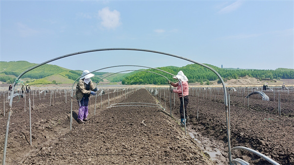 在敦化市大桥乡崎岖村参地里呈现出一派热火朝天的繁忙景象,四五十位村民正紧张有序地忙碌着,一个个柱脚被精准打入土地,一粒粒人参种子带着希望播撒在田间……“通常情况下,人参需要在土壤中生长至少5年才能达到充分成熟。这片参地里既有生长2年的新苗,也有即将起参的4年植株,丰收近在眼前。”崎岖村参地的负责人张俊团是一位参农,他带领着长期工们负责人参种植及田间管理。农忙时节,周边村民在此务工,一年能增收上万元,人参产业正成为带动乡村振兴的重要引擎。