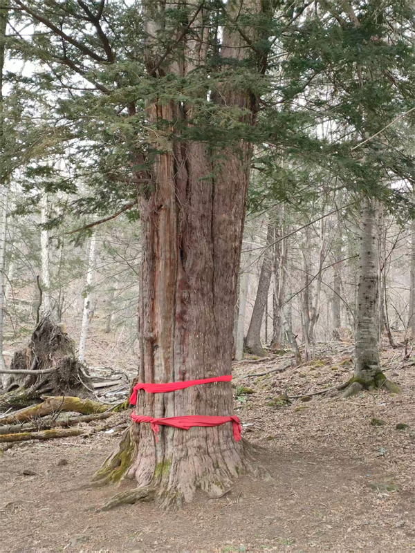 近日,记者从敦化市区驱车出发,经历近两个小时车程到达石门子林场,再徒步登山一个小时左右,在长白山余脉原始森林一众俊秀挺拔的树木中,看到了这棵千年古树。这棵红豆杉的树冠丰满挺拔、枝繁叶茂、长势良好,树皮呈红褐色,需要3个成年人手牵手方能环抱。虽历经千年岁月风霜,却依旧以蓬勃姿态屹立于海拔800米的针阔混交林中。