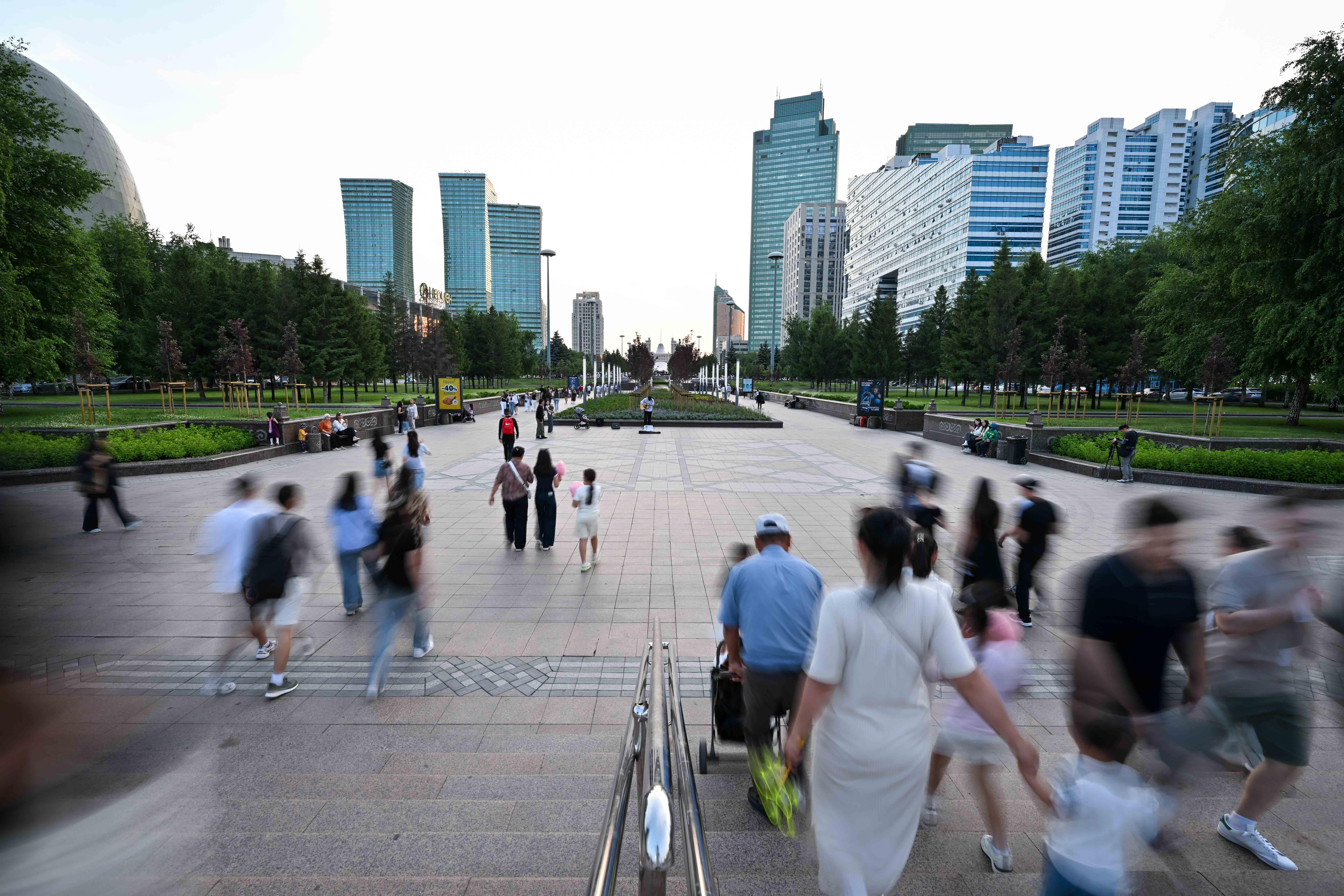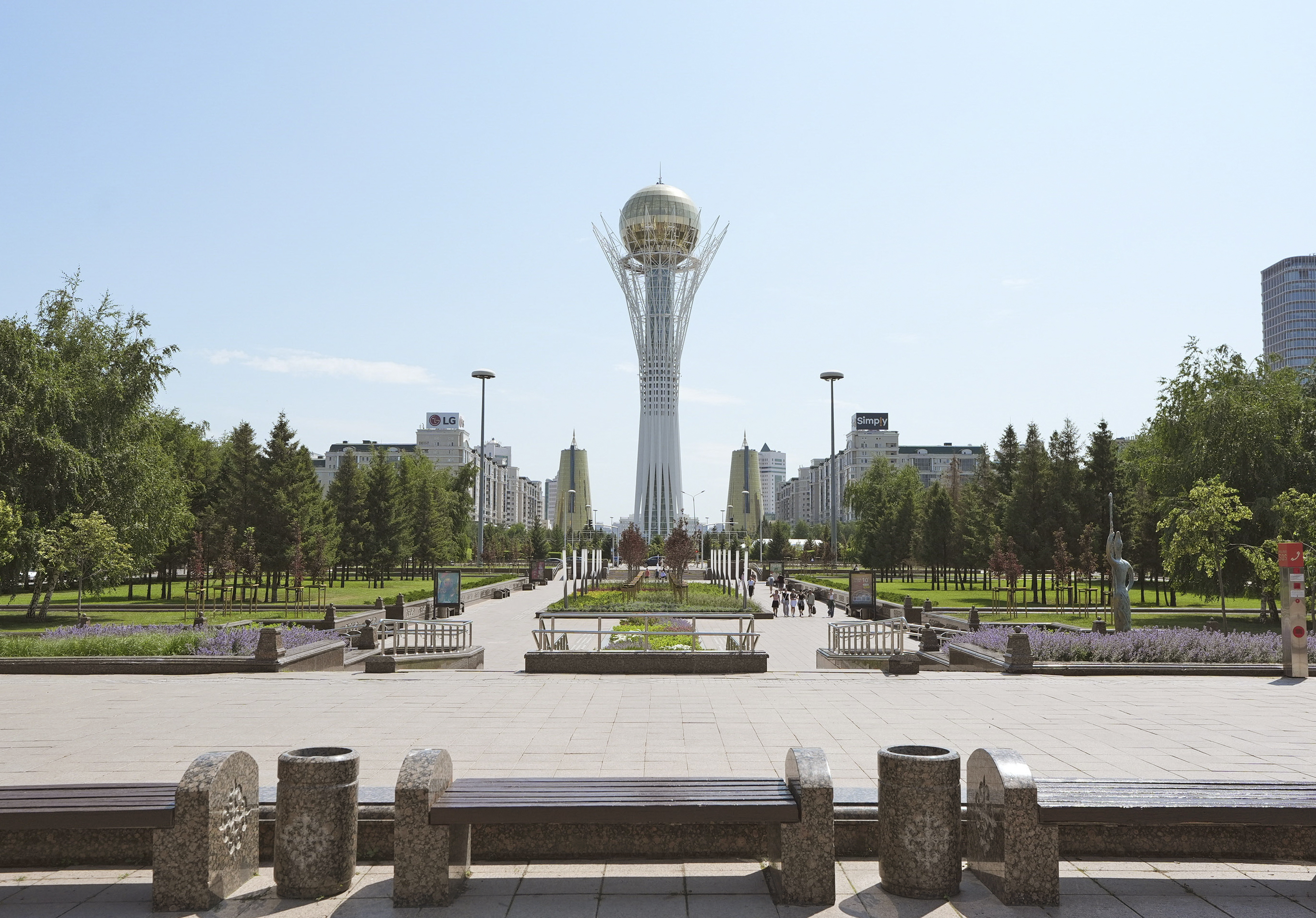 夏日的阿斯塔纳,天气晴好、鲜花盛开,天际线在蓝天白云的映衬下格外美丽。