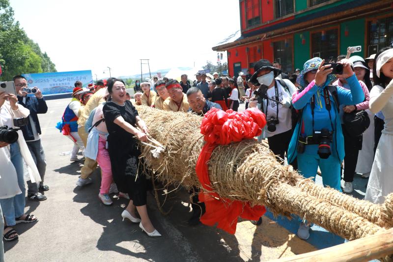 活动现场,现代元素与传统艺术交融的非遗主题文艺演出拉开了活动序幕。电子音效与长鼓节拍碰撞出奇妙的火花,随着朝鲜族背架舞、假面舞、象帽舞等传统舞蹈表演的演员们足尖起落,曼舞的裙摆在清风中绽放如花……一场极具艺术感染力的非遗视听盛宴让各族群众唱在一起、跳在一起、笑在一起,定格出一幕幕其乐融融、不分彼此的动人画面。呐喊声、加油助威声从不远处浪涌而来。只见现场观众自成两队,兴致高涨地投入到“朝鲜族拔草龙”的激烈比拼中,铆足劲头,你进我退、互不相让,欢声笑语此起彼伏。
