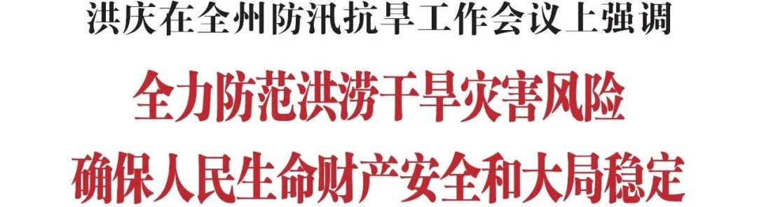 洪庆强调,要全力防范,强化措施,筑牢防汛抗旱安全之堤。补齐防御短板,抓紧抓实防汛工程建设,进一步提升全州防洪排涝能力。严格执行水库调度规程,强化蓄水管理,科学调整水库库容。加强城市排水管网改造、排涝沟渠清淤疏浚、排水设施维护管理,确保外洪能防、内涝能排、人员能撤。加强山地灾害监测预报预警,劝离处于危险区域的群众。不断健全应急保障体系,强化预案演练、防汛物资储备及队伍能力建设,做好防灾避险知识宣传普及。