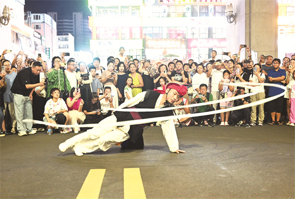 延边大学门前,“夏夜遇非遗·清爽游延边”歌舞展演每晚吸引着众多市民和游客驻足。活动将持续至9月3日,每日19:20至19:50与20:10至20:30由延边歌舞团及各县市文艺团体轮番献艺。长鼓引领节奏,小锣清脆、大锣浑厚、圆鼓铿锵——四物乐交织出欢悦韵律;联合国教科文组织人类非物质文化遗产代表项目中国朝鲜族农乐舞(象帽舞)更是焦点,飘带翻飞如环似线,赢得阵阵喝彩。惊喜不止于表演,现场不定时派发的“畅游延边大礼包”,内含《五彩阿里郎》《四季如歌》等热门演出优惠票、中甲联赛球票,点燃游客探索延边的热情。