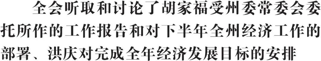 全会听取和讨论了胡家福受州委常委会委托所作的工作报告和对下半年全州经济工作的部署、洪庆对完成全年经济发展目标的安排。