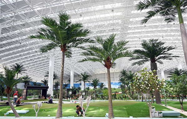 该项目位于延吉高新区东部,目前已进入收尾阶段。记者在施工现场看到,场内外建设正紧锣密鼓地同步推进。大气的场馆外形,已成为该区域的标志性建筑。走进场馆,高大的仿生棕榈树、高低起伏的人造草坪,专业级数字竞技场馆雏形初现。