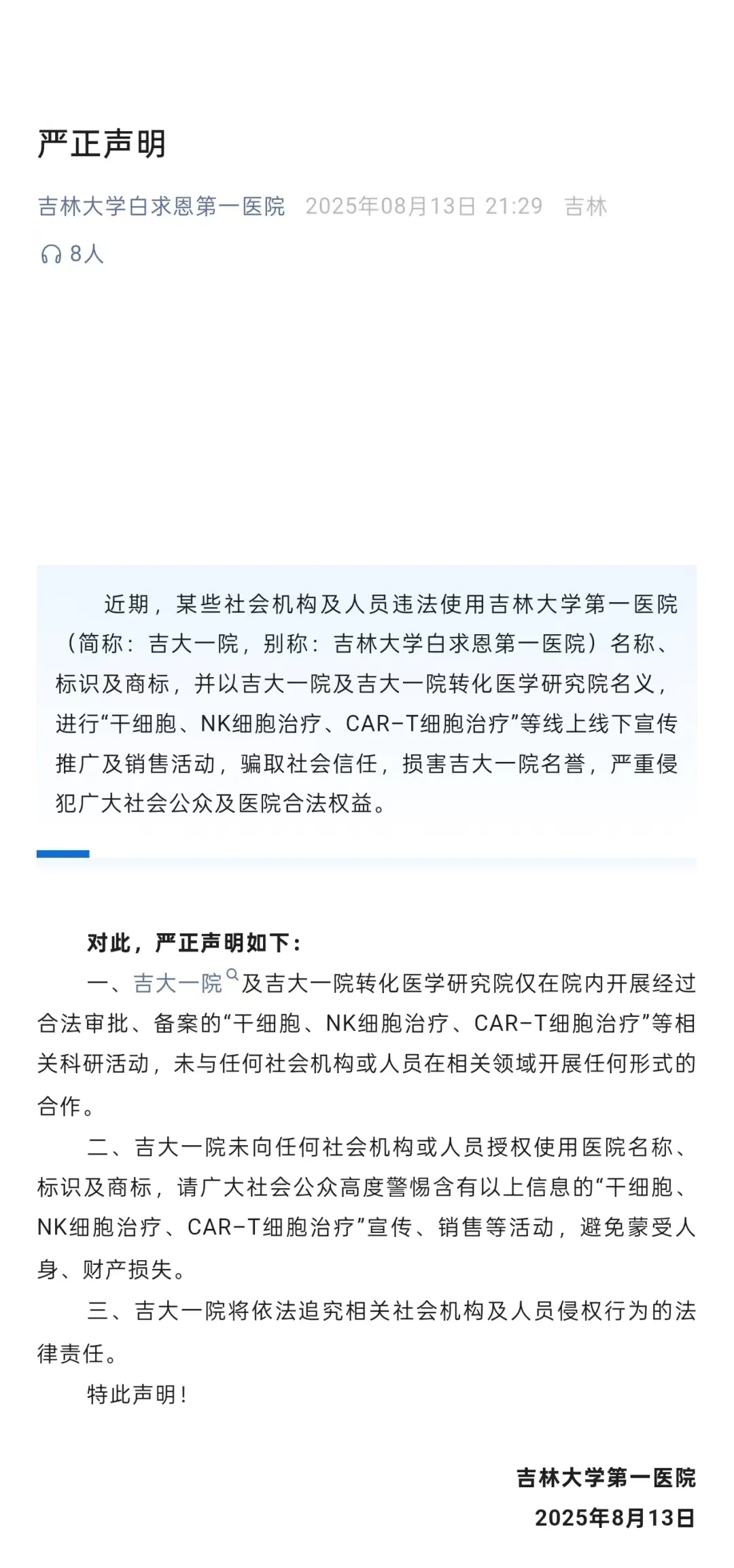 8月13日,吉大一院发布关于警惕某些社会机构及人员以吉大一院及吉大一院转化医学研究院名义,进行“干细胞、NK细胞治疗、CAR–T细胞治疗”等线上线下宣传推广及销售活动的声明。声明指出,吉大一院及吉大一院转化医学研究院仅在院内开展经过合法审批、备案的“干细胞、NK细胞治疗、CAR–T细胞治疗”等相关科研活动,未与任何社会机构或人员在相关领域开展任何形式的合作。医院亦未向任何社会机构或人员授权使用医院名称、标识及商标,请广大社会公众高度警惕含有以上信息的“干细胞、NK细胞治疗、CAR–T细胞治疗”宣传、销售等活动,避免蒙受人身、财产损失。声明如下:
