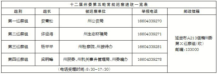 巡察期间,各州委巡察组设立专门举报电话和邮政信箱,主要受理反映被巡察单位领导班子及其成员、下一级党组织主要负责人和重点岗位人员问题的来电、来信、来访,重点是关于违反政治纪律、组织纪律、廉洁纪律、群众纪律、工作纪律、生活纪律等方面的举报和反映。受理信访时间截止到2025年9月30日。