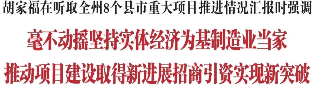 胡家福指出,项目建设是拉动投资的有力引擎,是推动经济发展的重要支撑。只有牢牢抓住项目建设这个“牛鼻子”,推动县域经济发展才有坚实可靠的依托,加快延边跨越赶超才有持续不断的强劲动能。各县市要坚定“项目为王”理念不动摇,坚持问题导向,精准施策发力,推动在谈项目早日落地、签约项目尽早开工、在建项目加速推进,以项目建设的显著成效为县域经济发展蓄势赋能。要推动项目建设再提速,坚持能早则早、能快则快,扎实落实“一项目一专班”工作机制,动态掌握项目最新进展情况,深入落实“并联审批”、“容缺受理”等措施,扎实做好用地、用能、用工等要素保障,优化施工组织管理,加大施工力量投入,千方百计抢时间、抢进度,力争项目早日建成投产、尽快发挥效益。要推动项目服务再提质,党政主要负责同志要经常深入项目建设一线,多进施工现场、多听企业心声,深入摸排了解施工需求,聚焦项目资金筹措、投资主体变更等环节靶向发力,着力打通各类堵点卡点,确保项目建设一路畅通、高效推进。要推动项目招引再提效,坚持全员上阵、全域出击,立足本地资源禀赋、产业基础和比较优势,聚焦发展制造业这个主攻方向,精准锁定招商地区、目标企业,主动上门拜访、靶向对接洽谈,对看准的优质项目要高频对接、竭力争取,对有合作意向的企业要紧盯不放、跟踪到底,推动一批投资规模大、带动能力强的制造业项目落地布局。
