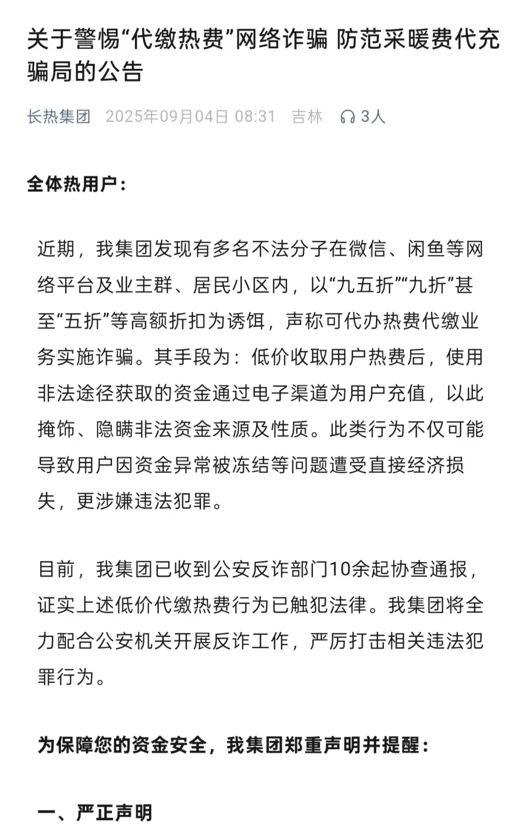 近期,有多名不法分子在微信、闲鱼等网络平台及业主群、居民小区内,以“九五折”“九折”甚至“五折”等高额折扣为诱饵,声称可代办热费代缴业务实施诈骗。9月4日,长热集团发布《关于警惕“代缴热费”网络诈骗 防范采暖费代充骗局的公告》。公告指出,长热集团目前无任何折扣优惠活动,所有“低价代缴”均属诈骗行为;从未授权任何个人或第三方代收热费。请广大用户务必通过官方缴费渠道缴费,任何声称与该集团合作的第三方平台或个人均属虚假宣传,请用户谨慎辨别,切勿使用其他非官方途径。