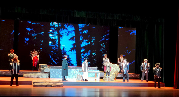 随着幕布缓缓拉开,演出正式开始。《血色戴营》讲述的是“九一八”事变东北沦陷后,吉东地区早期抗日斗争的一段真实的历史。1932年2月,吉林省敦化县沙河沿镇东南台子首富戴万龄,在年逾六旬之时,毅然决然舍弃几代人奋斗了半个多世纪累积的万贯家财,带领男女老幼四代57口人、全族200余人举旗抗日,带领“戴家军”先后跟随中国国民救国军、绥宁反日同盟军、东北反日联合军第五军、东北抗日联军第五军,英勇顽强地战斗在白山黑水,最后壮烈牺牲。到抗日战争胜利时,戴家投身抗战共计牺牲55人。戴家举家抗日的壮举,影响与带动越来越多工农大众投身抗战,在推动全民族抗战形成中发挥了重要作用。