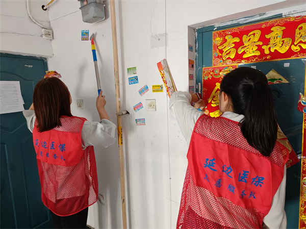 宣讲同时,州医疗保障局与社区工作人员携带清洁工具,协同推进“双清”工作。大家分工协作,对社区公共区域、楼道墙面、单元门口等处的非法小广告、反宣品进行集中清理。有的用铲刀仔细铲除顽固贴纸,有的用抹布擦拭墙面污渍,不放过任何一处卫生死角。“双清”工作结束后,于景岱一行人又前往重点绿化点位——旭春花园12号楼南侧空地,实地查看该区域绿化养护、环境整治情况,详细询问工作人员日常绿化管理措施及现存困难,并结合实际提出针对性管理建议,为持续改善社区居住环境、提升居民生活幸福感找准方向、夯实基础。