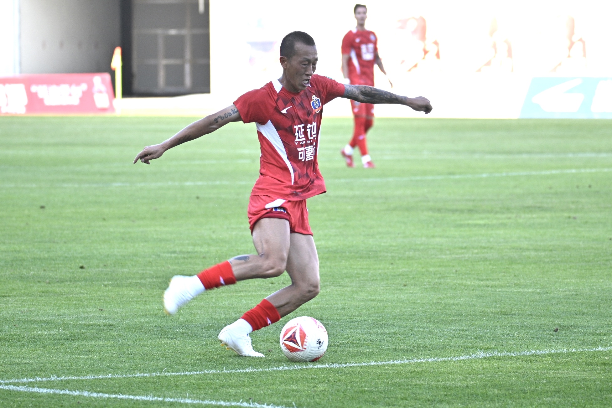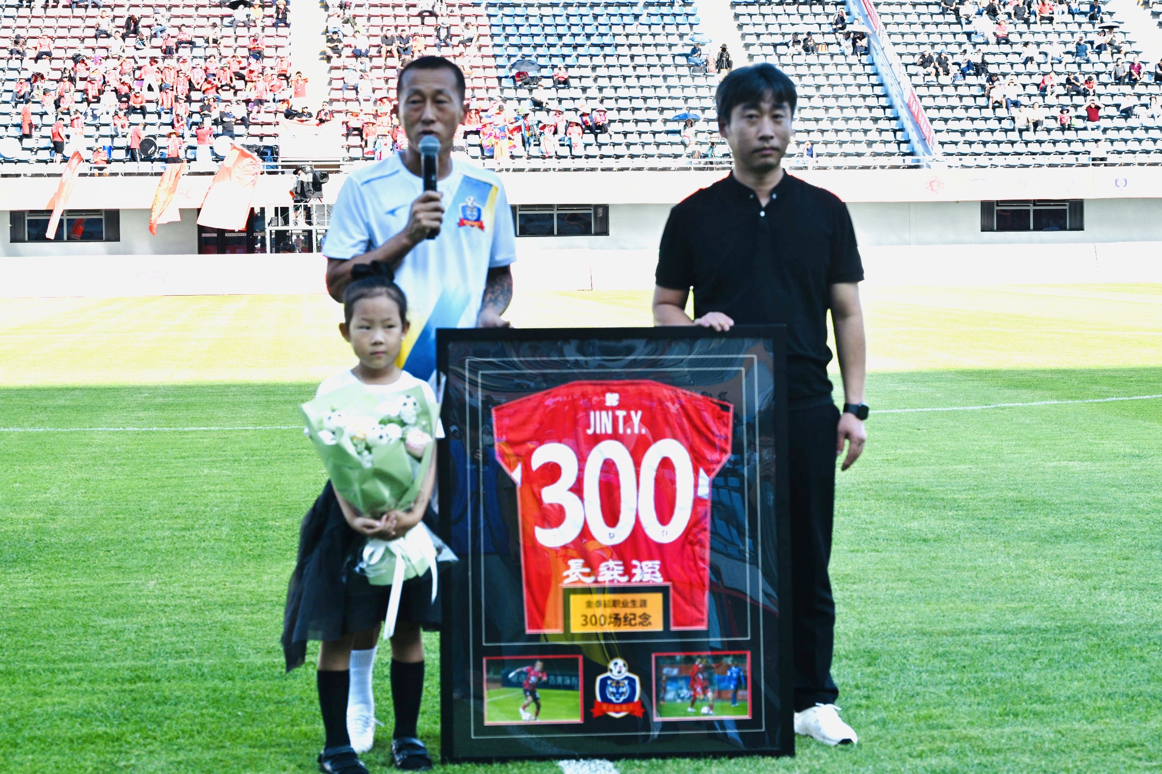 比赛还未开始,延吉市全民健身中心体育场就呈现出一片欢乐的氛围。老将金泰延刚刚还在赛前训练中奋力奔跑,一会儿便身着白蓝黄相间的训练服,走到绿茵场中央。原来,本轮是金泰延职业赛的第300场比赛,延边龙鼎足球俱乐部专门为他举行职业生涯300场纪念仪式。