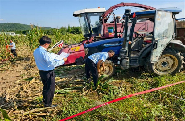 此次演练模拟了一起典型的田间作业事故场景:在勇成村三队的田间场院,一台轮式联合收割机与一台接粮作业的轮式拖拉机运输机组在协同作业时,因后方拖拉机驾驶员操作不当,发生追尾碰撞“事故”。“事故”发生后,现场人员立即向龙井市农业综合行政执法大队报案。