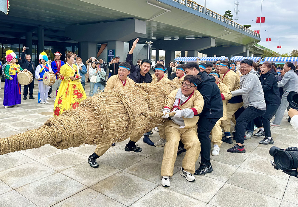 “人民高铁人民剪彩”,一场民族风情浓郁的文化盛宴成为高铁开通最特别的庆祝仪式。活动现场人气鼎盛,“礼赞丰饶,守望传承”非遗展演精彩上演:朝鲜族鹤舞《长白鹤之乡》舒展灵动,歌曲《延边之恋》《阿里郎》悠扬婉转,民乐合奏《茉莉花》《桔梗谣》韵味悠长,舞蹈《喜悦》热情洋溢,生动彰显了民族文化的独特魅力与非遗传承的深厚底蕴。“团结之绳,丰收之龙”朝鲜族拔草龙活动中,当地群众与游客组成的队伍在锣鼓声中奋勇角逐,在欢乐竞技中传递着伟大团结精神。非遗体验区内,朝鲜族美食制作、乐器互动、传统技艺展示、文创产品展销等沉浸式项目,让游客近距离感受延边民俗的鲜活生命力。