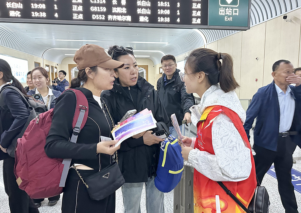 当日11时48分,满载乘客的沈白高铁G8167次首发列车准时抵达长白山站。列车车门开启后,州文广旅局局长刘冬梅带领工作人员早已等候在站台,为下车乘客送上延边文旅畅游联票与鲜花等“见面礼”,热情邀请大家深度体验延边风情。“高铁开通太方便了,这下能好好逛逛延边的美景、尝尝特色美食了!”来自沈阳的游客全丽难掩兴奋之情。