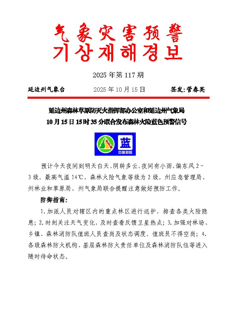延边州发布森林火险蓝色预警信号