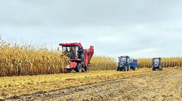 大石头镇永青村的田间地头一派繁忙景象,大型联合收割机正在忙碌作业,一棵棵玉米被割倒,金黄的玉米棒子从收割机的出粮口倾泻而下,装满了运粮车……敦化市联益农副产品供销合作联社理事长赵显清说:“今年我种植了1000公顷玉米,从10月初开始收割,全靠农机配套得好,现在已收割入库80%以上!”谈及秋收效率高的秘诀,他笑着说:“春天种玉米用的是五行免耕播种机,播种又快又匀;秋天收玉米就用这台配套的五行玉米联合收获机,从摘穗、剥皮到秸秆粉碎一气呵成,比传统人工收割快了好多倍。”