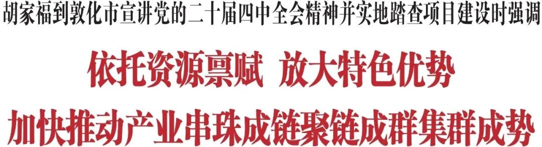 11月19日,省委常委、州委书记胡家福到敦化市宣讲党的二十届四中全会精神,并就项目建设进行实地踏查。他强调,要深入学习贯彻习近平总书记重要讲话和党的二十届四中全会精神,依托资源禀赋,放大特色优势,加快推动产业串珠成链、聚链成群、集群成势,促进县域经济提质扩量、争先进位。