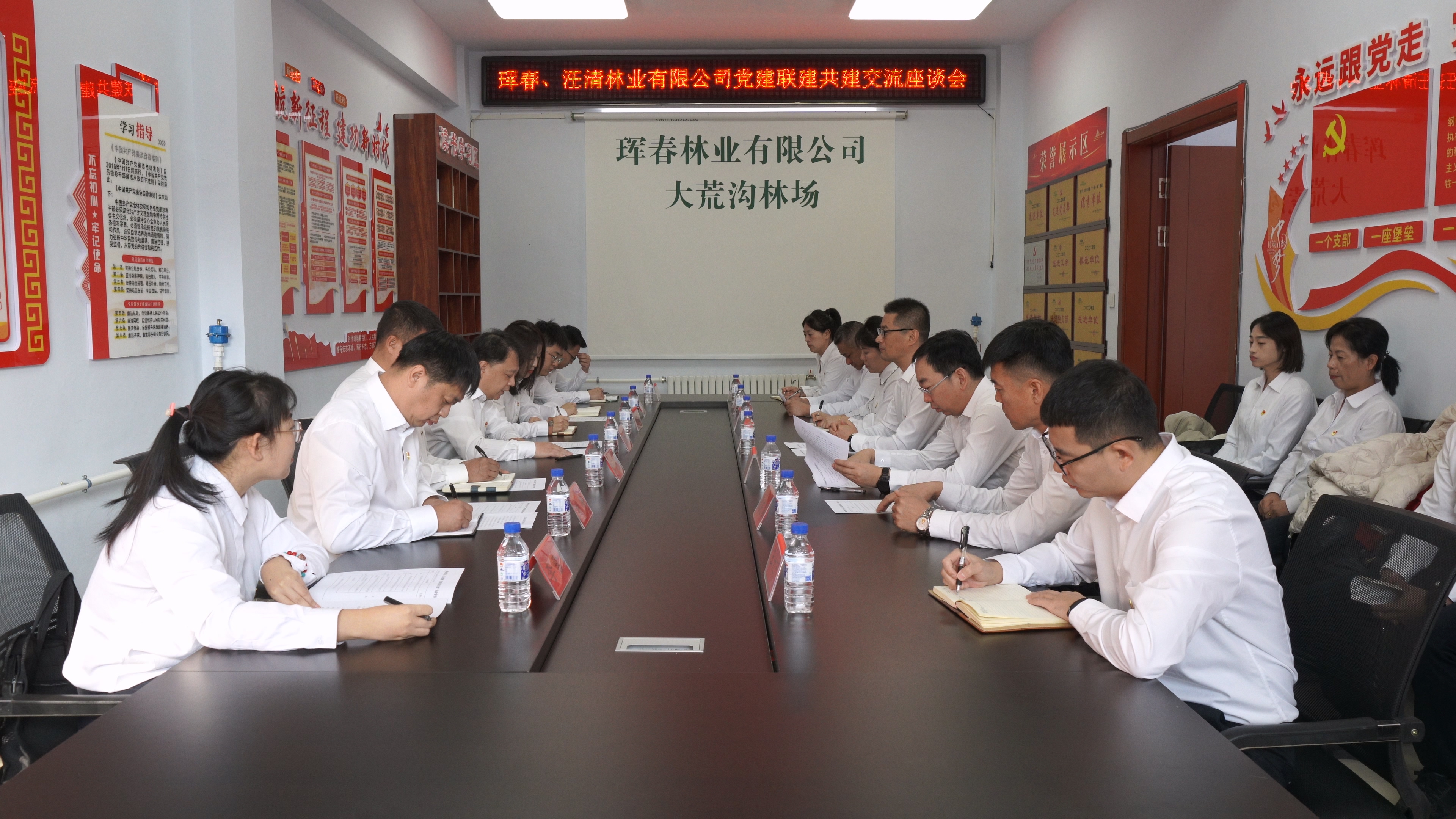 珲林党委副书记崔凯主持了此次活动。在这次活动中,汪林党委副书记陈凤山领学了党的二十届四中全会精神。随后,珲林与汪林党委组织部负责人分享了党建工作的特色与亮点。双方基层党组织书记结合党建引领、支部攻坚及党建融入林场中心工作促进高质量发展的生动实践和鲜活案例等内容进行了交流发言。座谈期间,双方还围绕支部标准化建设、党员教育管理、党建品牌创建以及党建与业务融合等方面开展深入交流。在思想的激烈碰撞中,新的思路与方法不断涌现,进一步明确了未来党建工作的方向与目标。同时,双方还将以此次联建共建活动为抓手,丰富共建形式,开展联学联建、业务帮扶结对等活动,互学互鉴、互帮互助,全力打造“党建共建”品牌,推动党建工作与生产经营、生态保护、国企改革、转型发展等业务工作深度融合,为实现公司高质量发展提供坚强的组织保障。