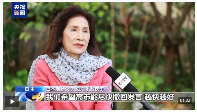 日本前参议院议员 系数庆子:在我们看来,完全不应该发表这样的言论,完全是干涉别国内政的发言。在我们看来,她(高市早苗)已经不具备首相的资格了,这种发言的后果就是这么严重,那样的言论是绝对不该说出口的。从这一点来说,我们希望高市能尽快撤回发言,越快越好。