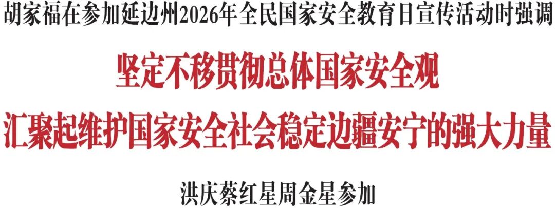 活动中,胡家福指出,延边地处中俄朝三国交界,在维护国家安全和边疆稳定上肩负着重大政治责任。全州各级各部门要深刻认识做好国家安全工作的极端重要性,牢固树立底线思维、极限思维,以更严要求、更高标准、更实举措统筹抓好发展和安全,切实做到守土有责、守土负责、守土尽责,以高水平安全支撑延边高质量发展、可持续振兴。要坚决防范化解各领域风险隐患,准确把握新时代国家安全形势的新特点新趋势,健全完善排查化解、专项整治、风险预警、应急处置全链条工作机制,切实维护好国家政治安全,统筹抓好经济、社会、文化、生态、边境等重点领域安全,确保全州社会大局稳定。要着力提升应对风险挑战的过硬本领,讲究政策策略,灵活运用方法手段,确保对各类风险隐患反应灵敏、研判精准、处置得当,切实把维护国家安全的主动权牢牢掌握在自己手中。要持续深化国家安全宣传教育,精准把握数字化、网络化、智能化发展大势,与时俱进推进宣传教育载体创新,依托线上平台、AI技术推出更多可视化、故事化的宣传教育产品,用接地气、有温度的表达让国家安全知识广泛传播,让更多群众愿意看、看得懂、记得住,努力营造全社会共同维护国家安全的浓厚氛围。
