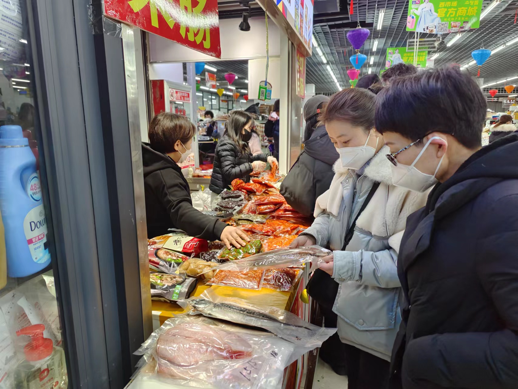 春节将至,为方便市民办置年货,延吉市西市场四楼专门设置了年货摊位,春联、灯笼、福字、生肖兔……满眼的中国红吸引大量的市民驻足挑选。热闹的人潮让延吉市西市场的年味儿越发浓厚,也让经营水豆腐生意的刘艳玲应接不暇。她说,延吉市西市场的热闹劲儿回来了,顾客越来越多,大家心里高兴,干劲十足。