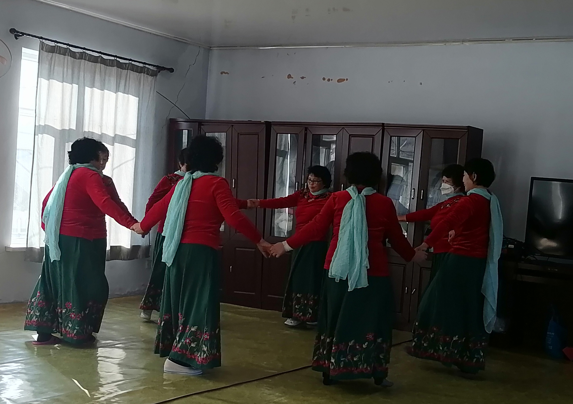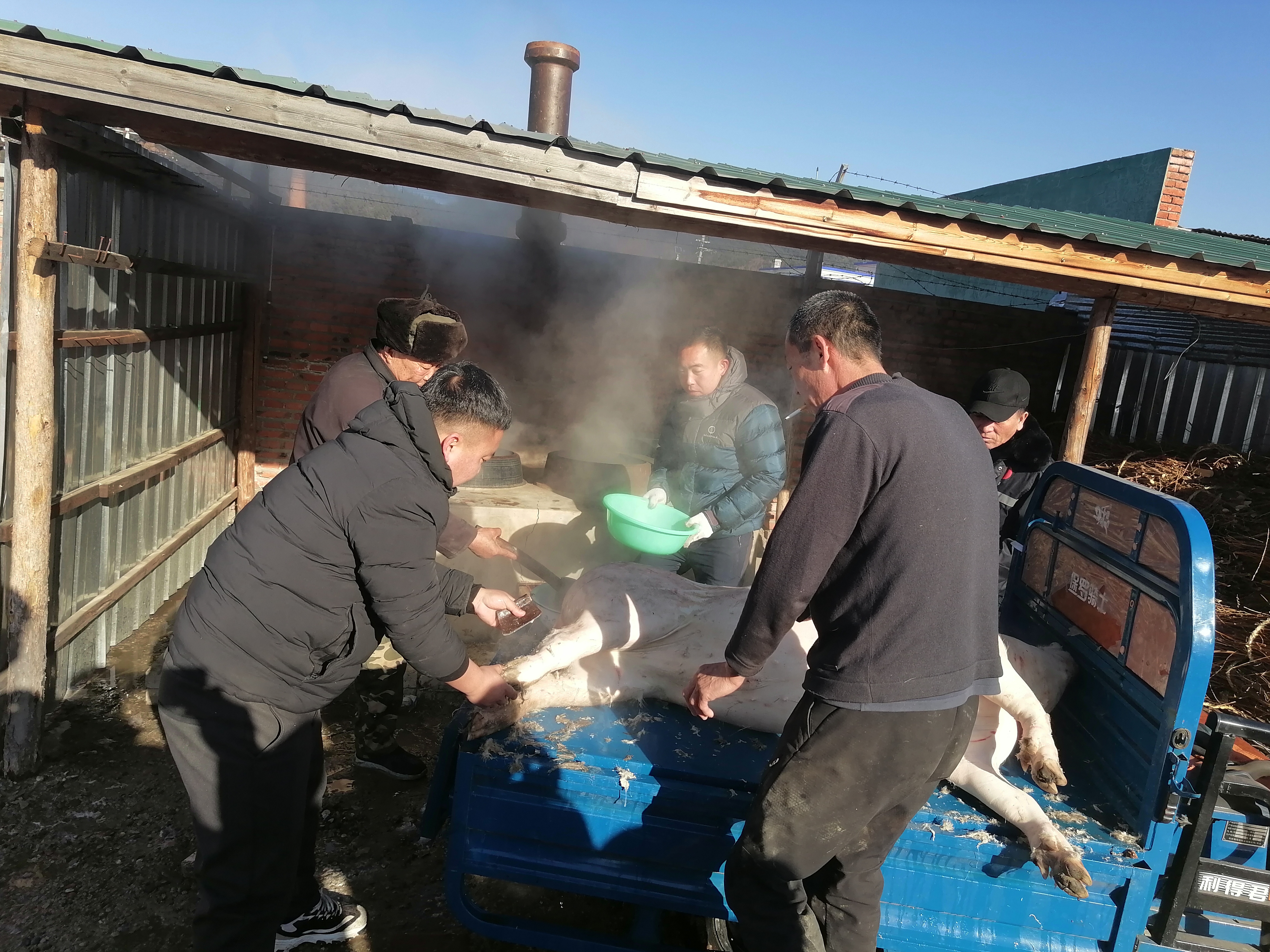 当日上午9时许,村门球场北面的灶台里炉火正在熊熊燃烧,铁锅里的水被烧得翻滚。在灶台前面的电三轮后车厢板上,放着刚刚宰杀完的近150公斤的大肥猪。村民们上前帮着褪猪毛,厨师们把猪开膛破肚,利落地将整头猪分解开来。活动室内,几位阿迈开始煮肉,配菜,灌血肠。大炕上十几位身穿靓丽服装的妇女在音乐的伴奏下跳起舞蹈。