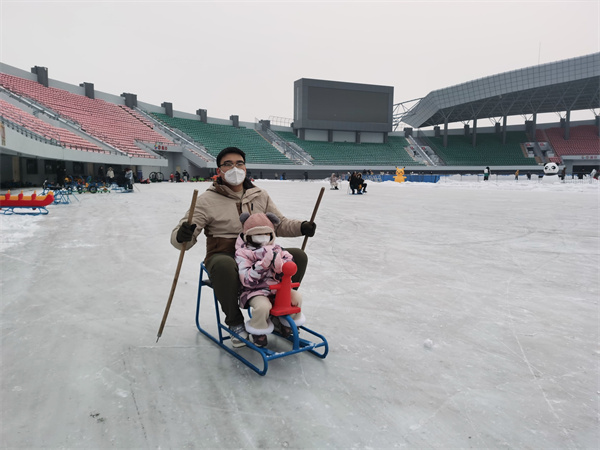 初到延边,金同森三岁的女儿小奶熙满眼欢喜,白雪皑皑、银装素裹在她眼中仿佛故事中的童话世界。“爸爸,爸爸,快来看这么高这么大的雪雕!”“妈妈,妈妈,雪圈真好玩,我也要滑……”在延西冰雪游乐场,小奶熙兴奋不已,一会儿吵着要看这个,一会儿又要玩那个,一个不留神摔得四仰八叉,逗得自己哈哈大笑,惹得金同森和妻子乐得前仰后合。滑雪圈惊险刺激,骑雪摩托、开亲子卡丁车体验速度与激情,传统冰车让夫妻二人找回童年的记忆……一下午时间,金同森一家三口体验了各个冰雪项目,玩得不亦乐乎。