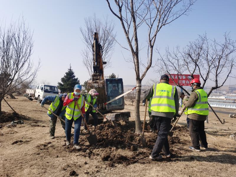 3月29日,记者在延吉市局子街与302国道交汇处三角地看到,铲车挖出合适的坑位,吊起待栽树苗,在工人配合下,准确摆进坑位,并将土方回填,一棵五角枫树稳稳矗立在绿化丛中。