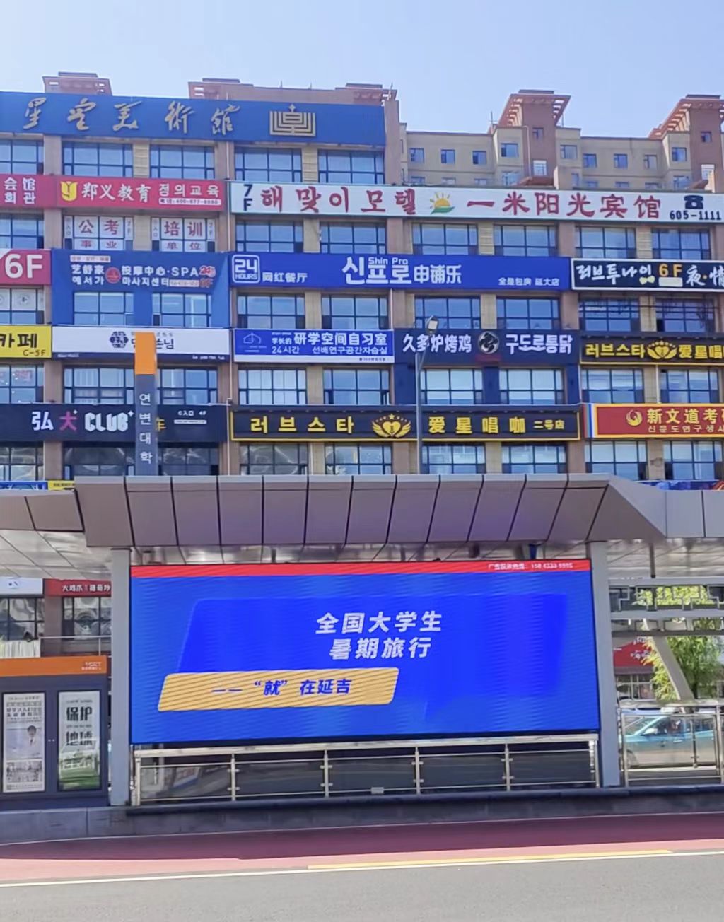 7月20日一早,延边大学“网红弹幕墙”前就汇聚了来自天南海北的游客,BRT快速公交延边大学站点的LED屏幕上,滚动播放着大学生暑期来延旅游“吃、住、行、游、购、娱”方面的优惠政策和“青年延吉”相关人才政策,大力度的优惠举措与补贴保障,展现了延吉市对于大学生群体的热烈欢迎和求贤若渴的满满诚意。